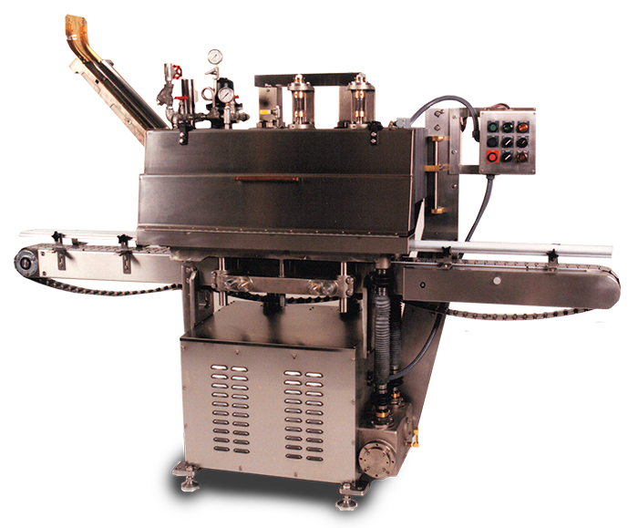 The Diversified Capping Equipment, now Dillin Capping Systems, Model 76-450 In-Line Steam Vacuum Capper is designed to apply lug caps, twist-off, or push-on caps to glass containers. Filled containers pass through the capper on a conveyor that is integral to the capper. Non-marking side belts grip the containers. The leading edge of the container pulls a cap from the cap feed chute as it is conveyed. After the cap is picked up, the container travels forward under the cap leveling plate, where it is leveled and simultaneously turned to engage in the first thread. The container then passes under a pair of cap tightening belts for final tightening.