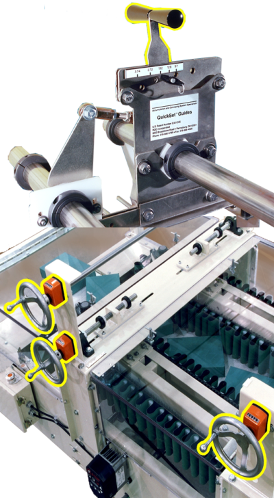 QuickSet changeover systems allow our customers to better utilize their equipment by enabling them to run multiple product sizes on the same system while enabling them to manually adjust long runs of guides and individual pieces of equipment in an efficient and cost effective manner. In order to provide this versatility to our valued customers we designed QuickSet changeover systems into our equipment.